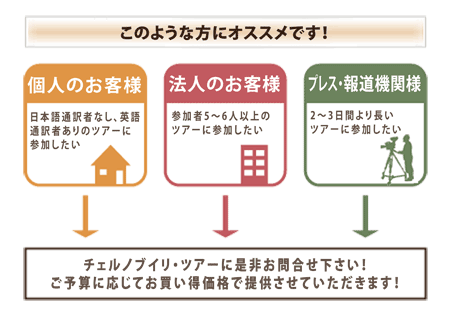 チェルノブイリ・ツアーでは2〜3日間より長いツアーの大口のご注文を検討されている方やツアー時の日本語通訳サービス費をを緊縮したい、英語を通じる方に掲載価格よりさらにお得な価格でご提供します。個人のお客様でも法人やキャメラマン、ジャーナリストおよびニュース報道機関などの専門家の方でも対応させていただきます。